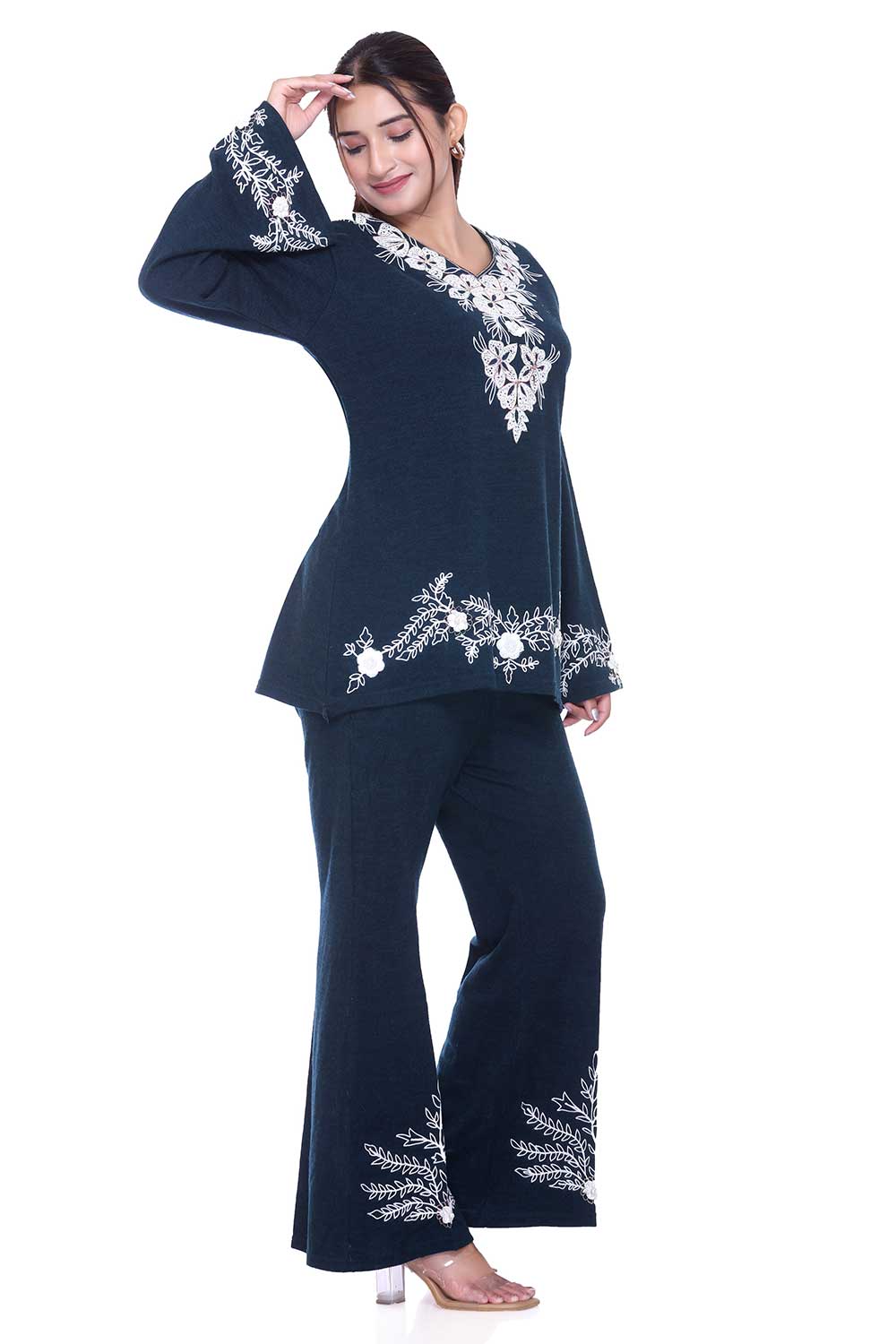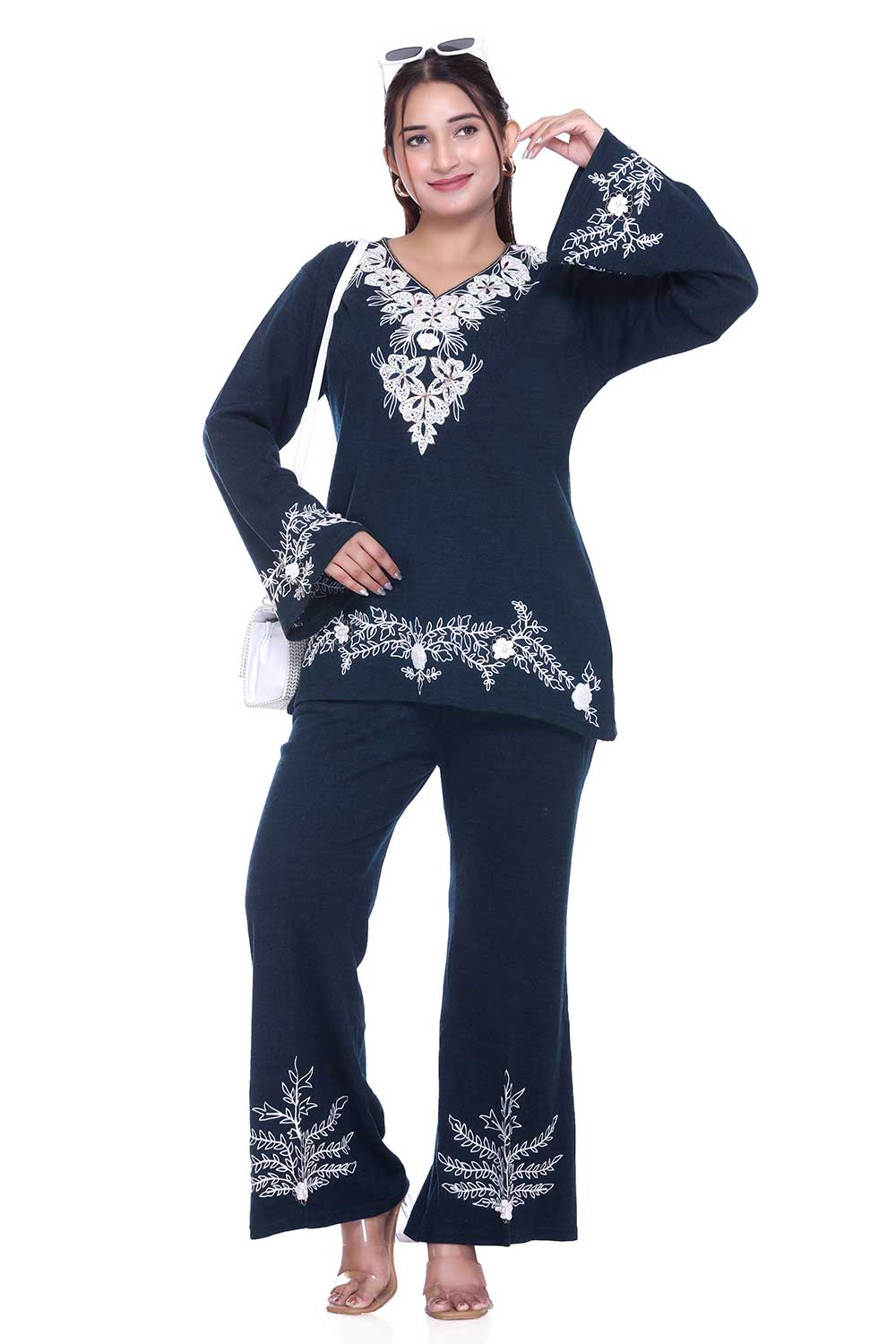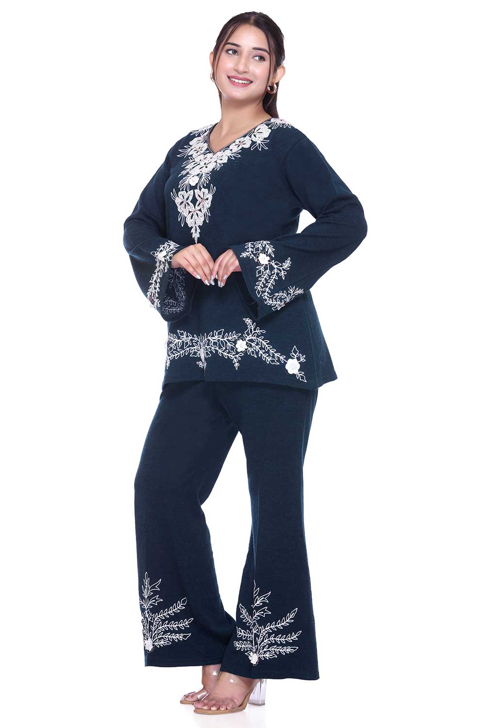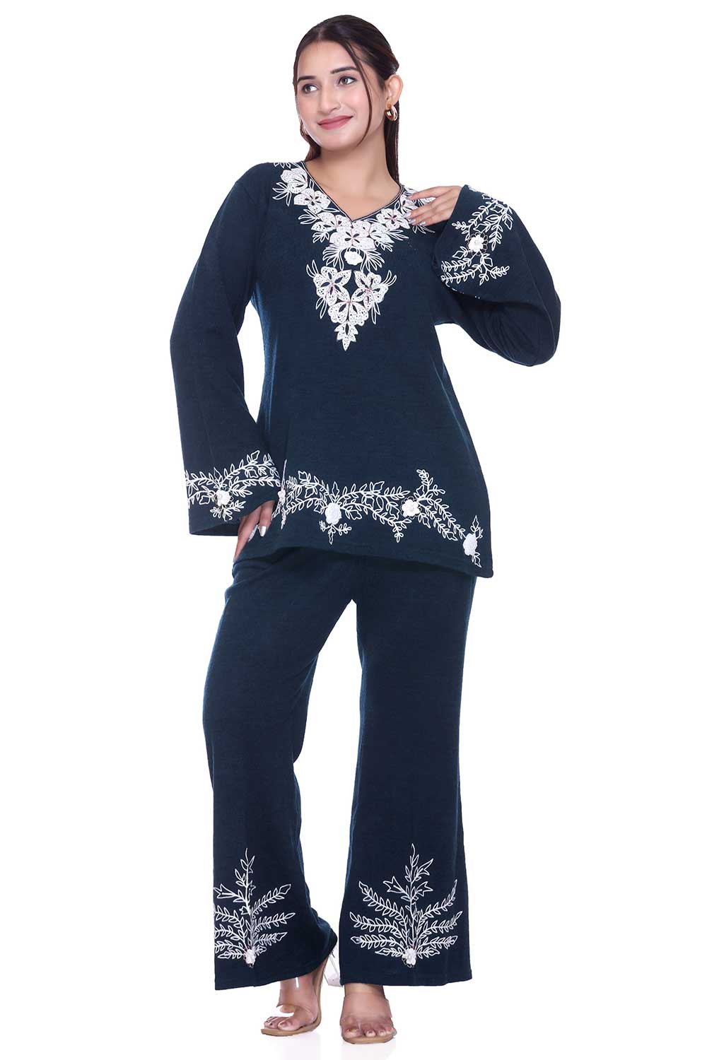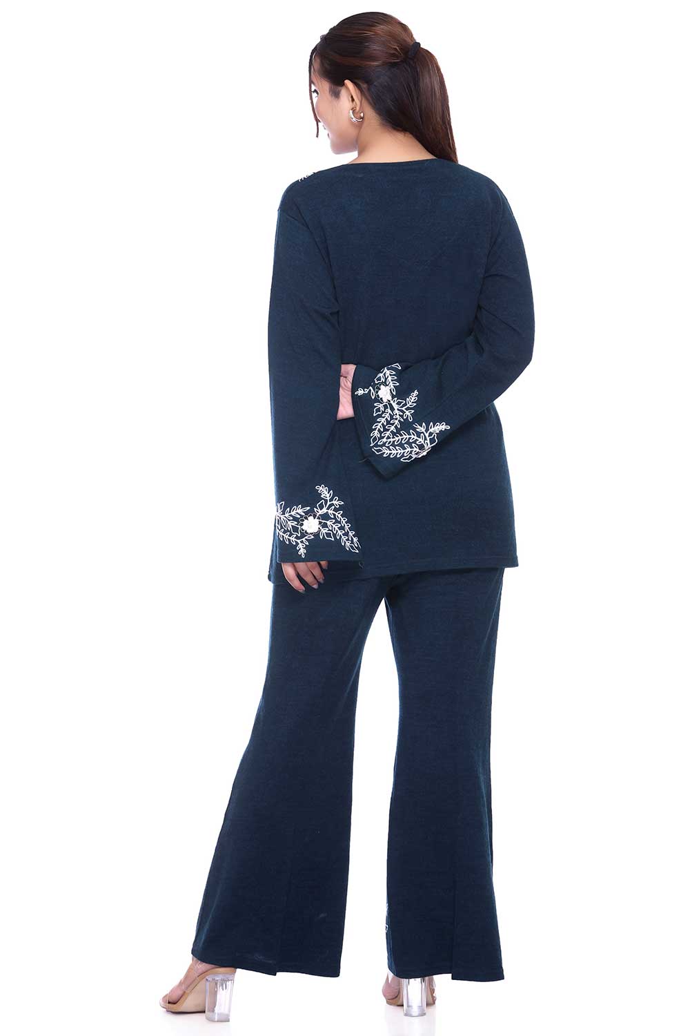 Step up your style game with this chic airforce blue embroidered co-ord set, designed for a perfect blend of comfort and elegance. The kurta-style top features delicate white floral embroidery on the neckline, sleeves, and hemline, paired with trendy bell-bottom pants that also carry matching embroidery for a coordinated look.