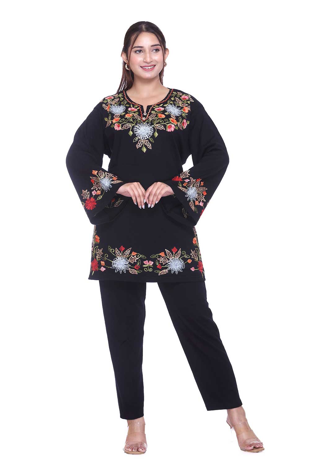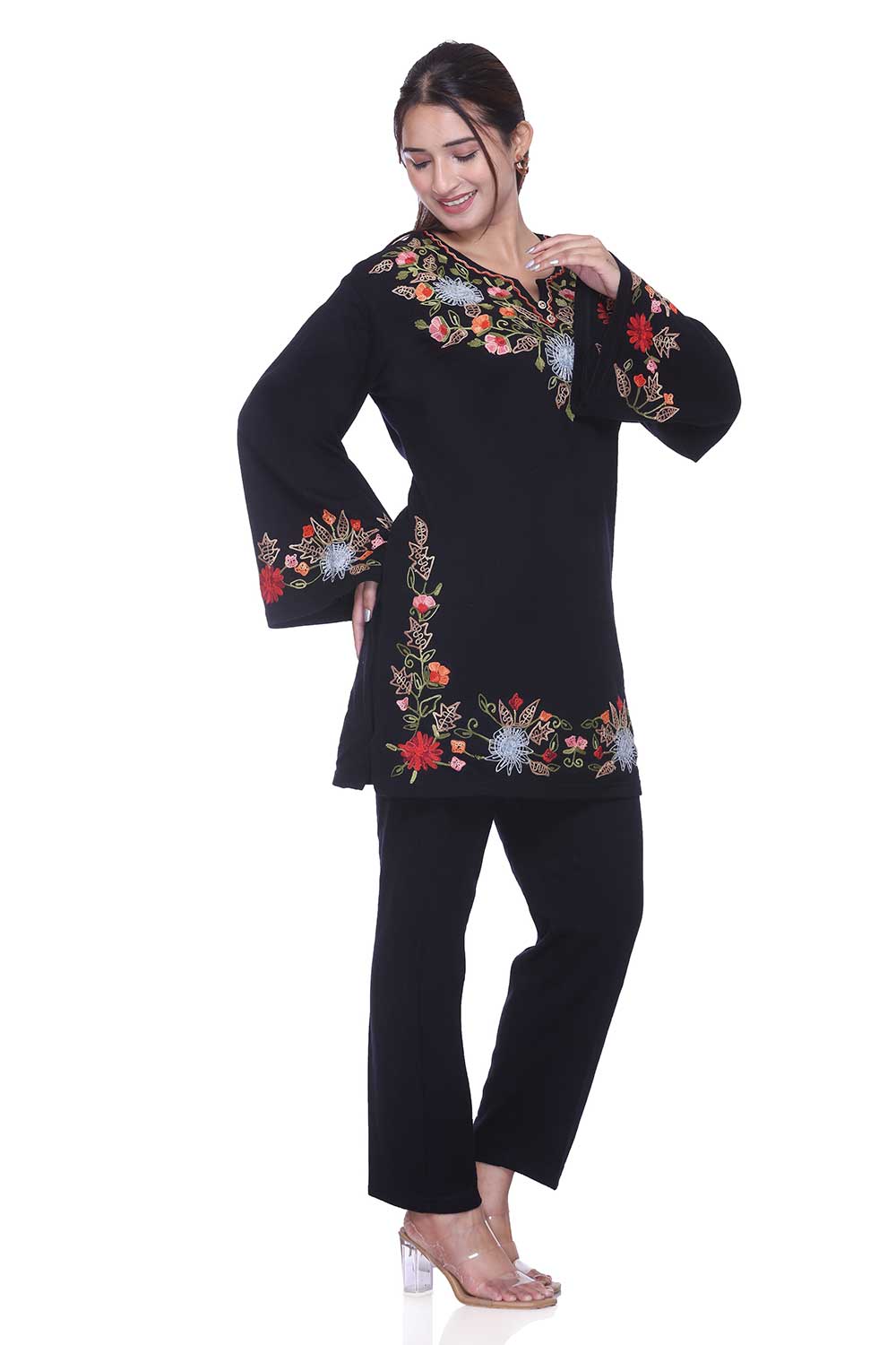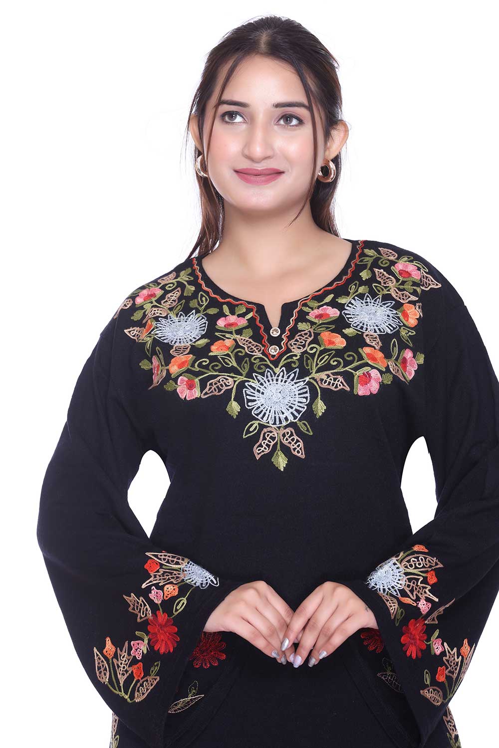 Bring Kashmiri elegance to your festive wardrobe with this stunning black pheran-style co-ord set. Designed with colorful floral embroidery on the neckline, sleeves, and hemline, this outfit combines comfort with traditional charm.