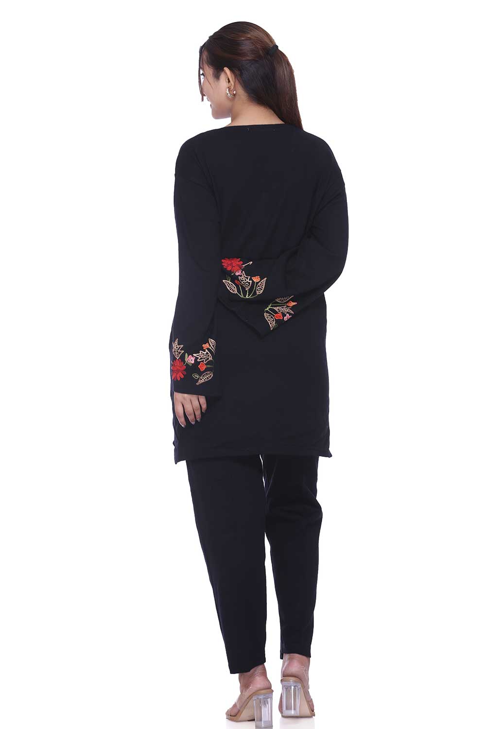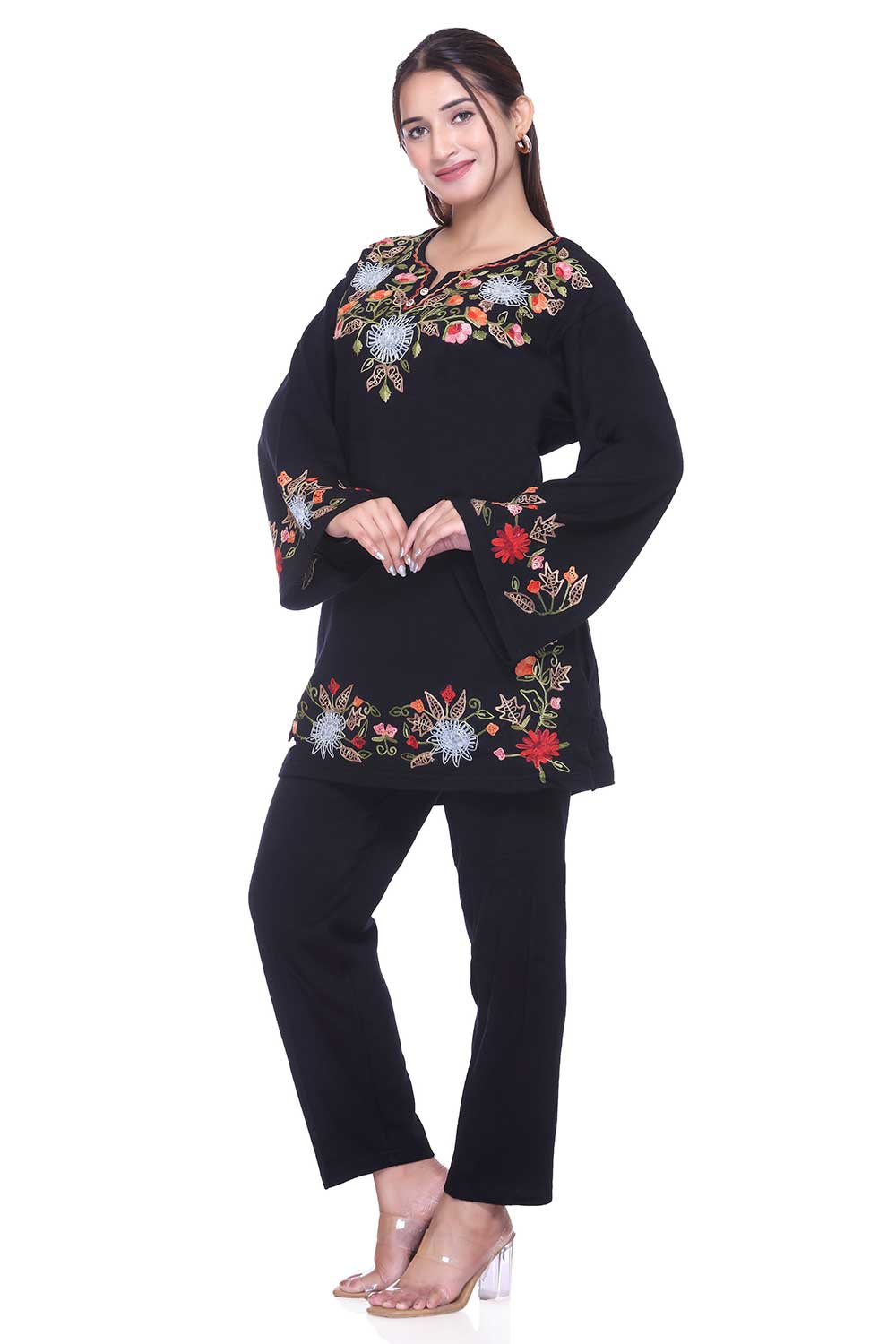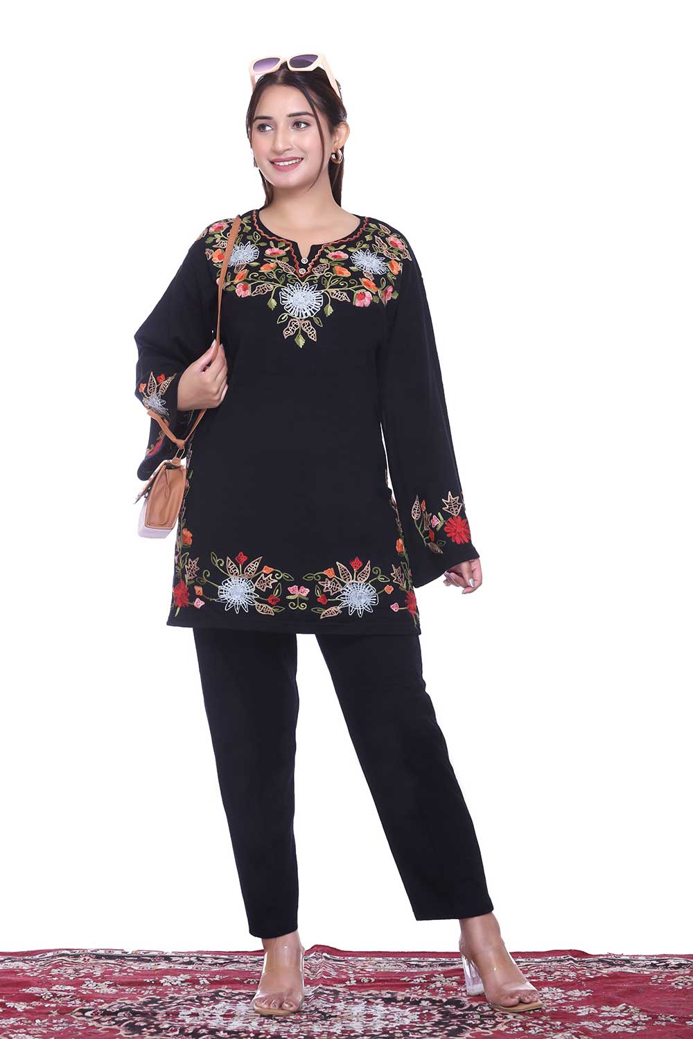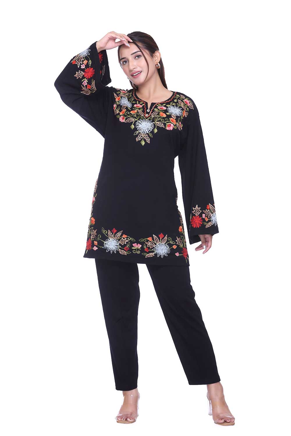 Bring Kashmiri elegance to your festive wardrobe with this stunning black pheran-style co-ord set. Designed with colorful floral embroidery on the neckline, sleeves, and hemline, this outfit combines comfort with traditional charm.