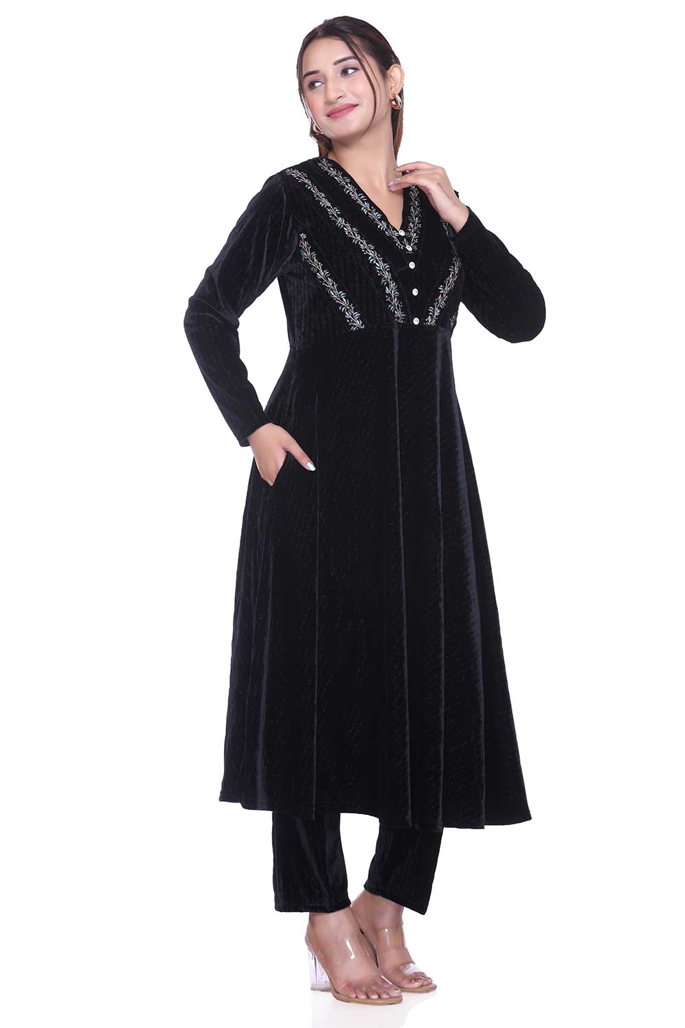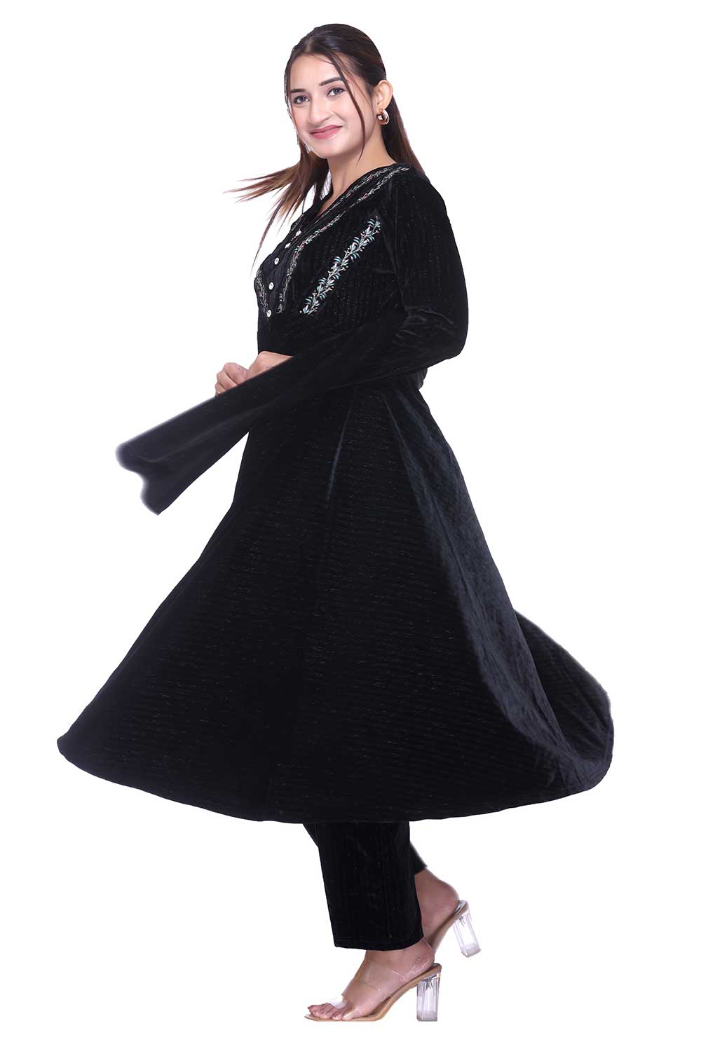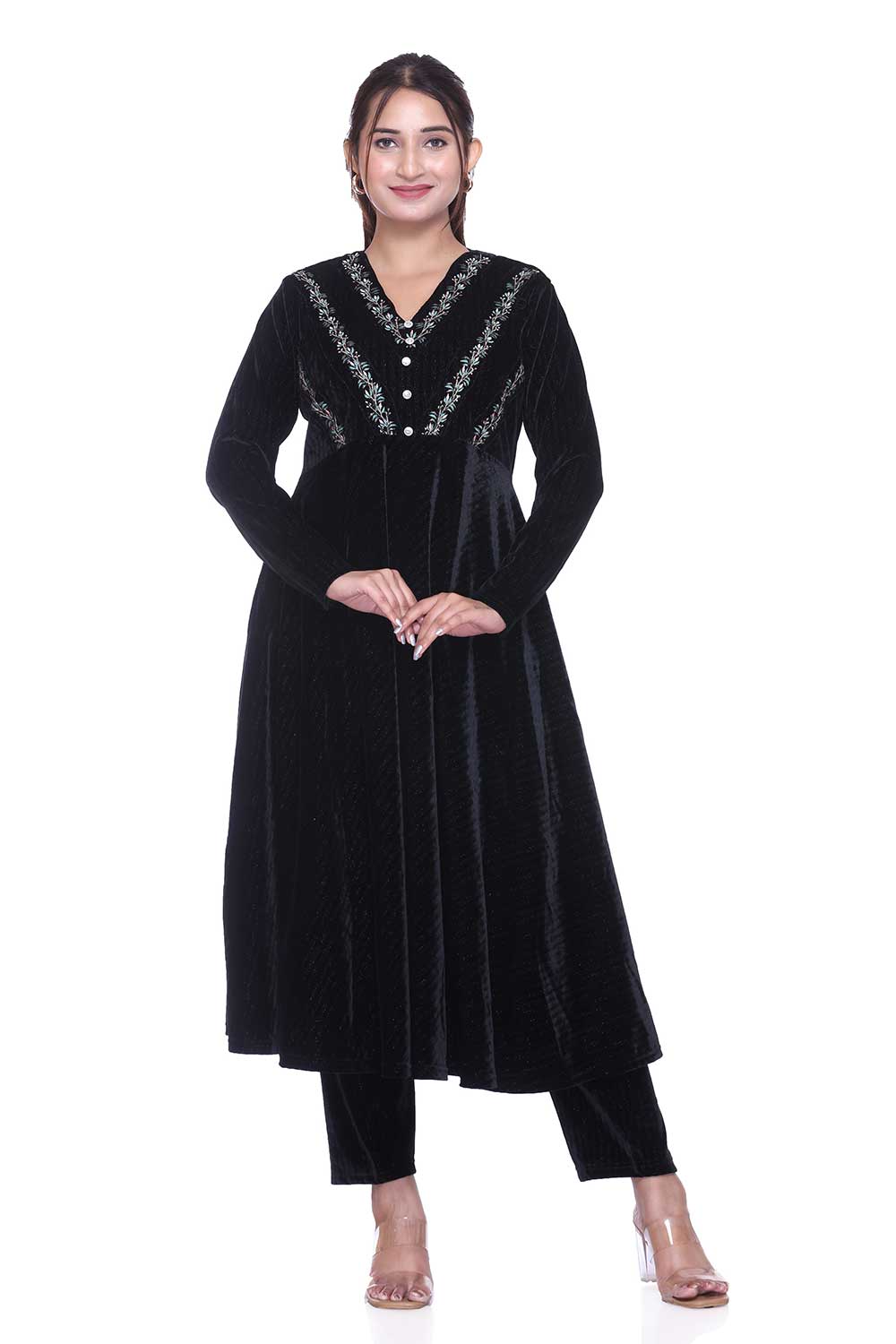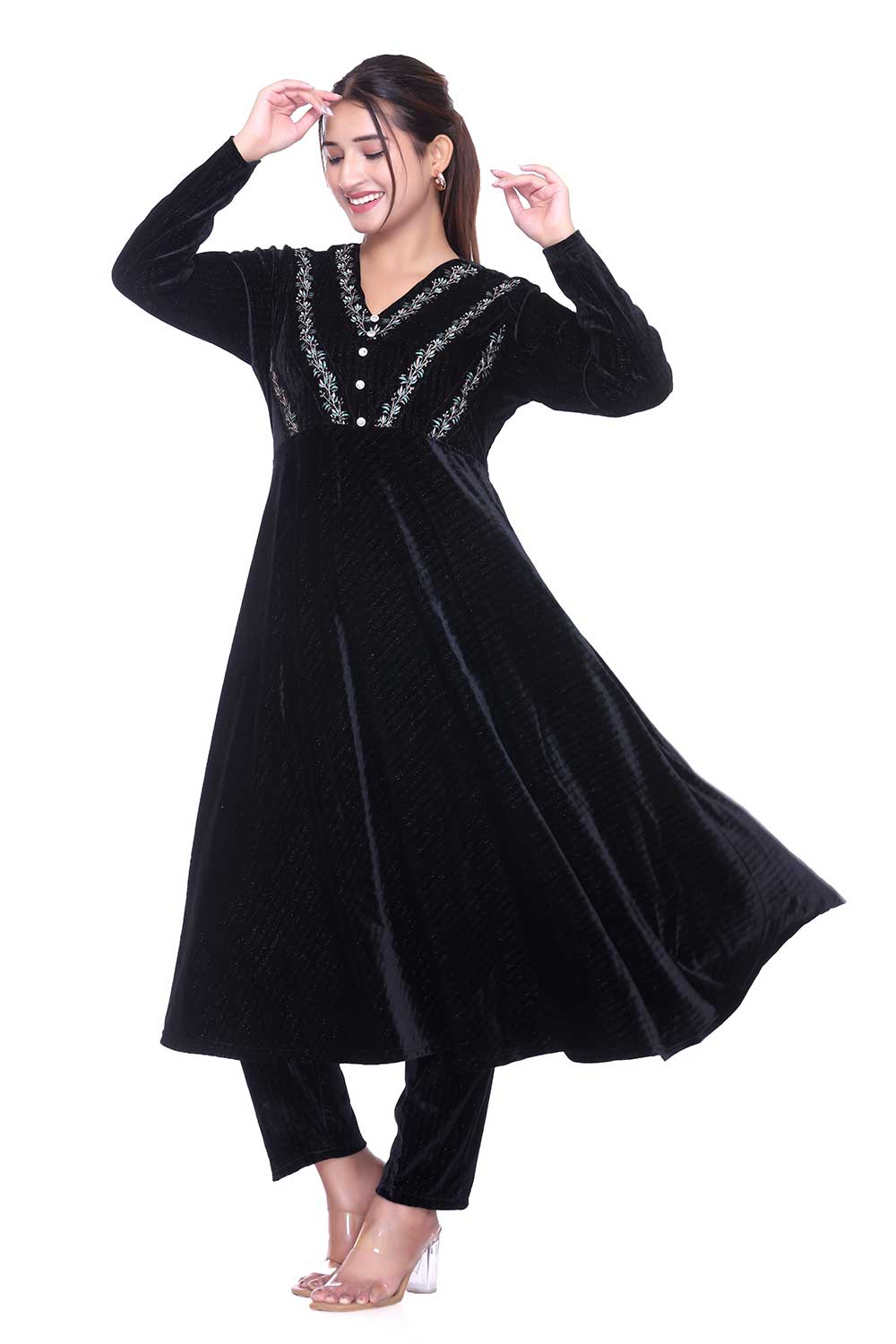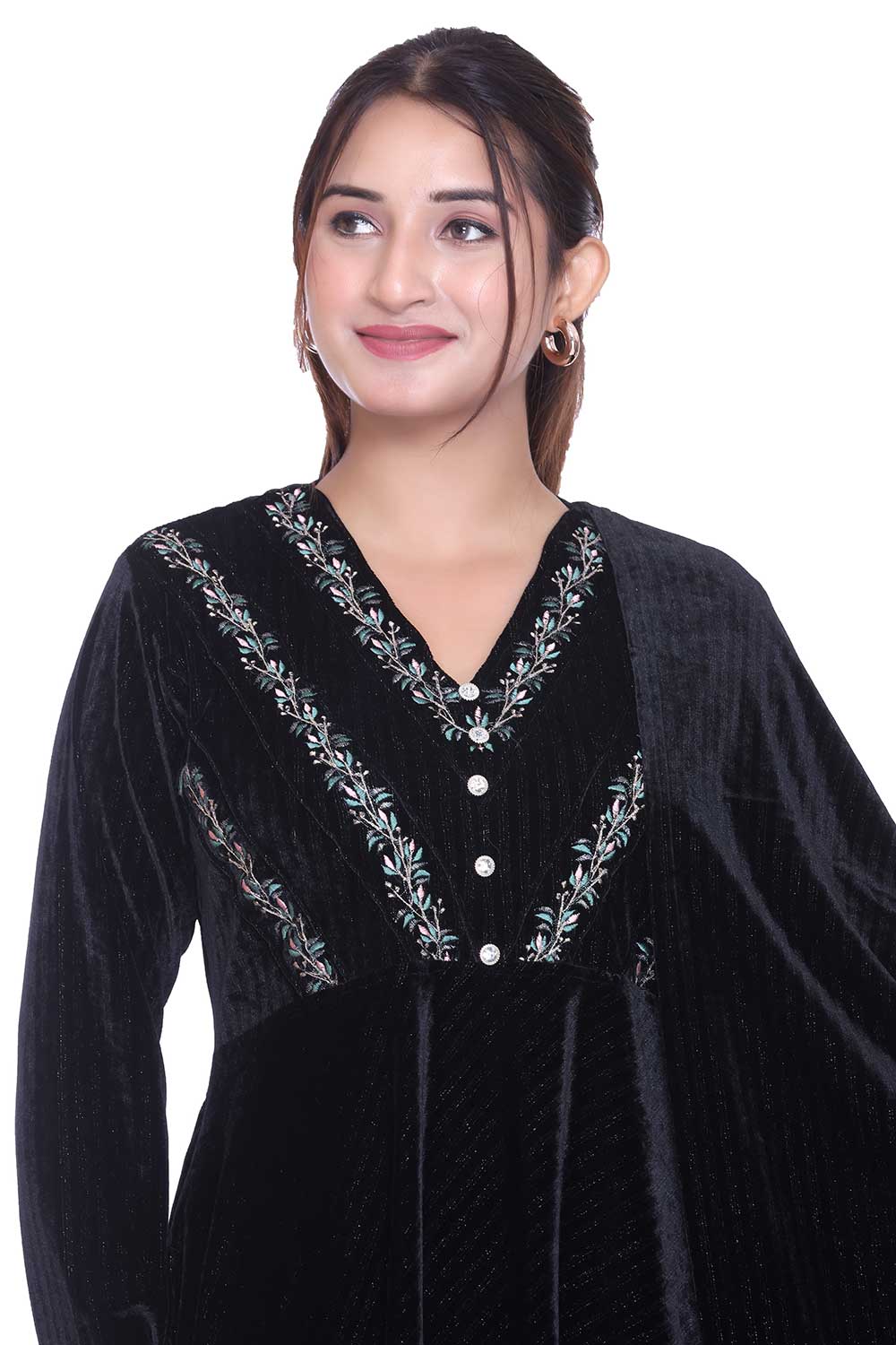 Add timeless elegance to your wardrobe with this stunning black velvet frock set, designed to make you stand out at festive occasions and evening gatherings. The flowy frock-style kurta features delicate embroidery on the neckline with button detailing, paired with straight-fit velvet pants for a graceful yet comfortable look.