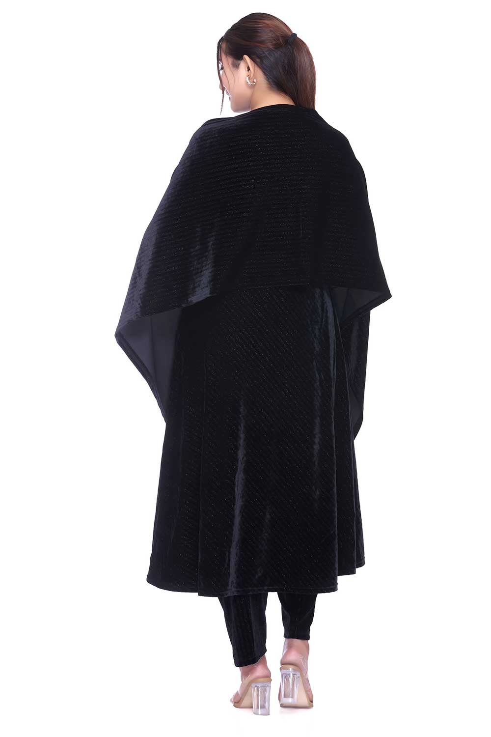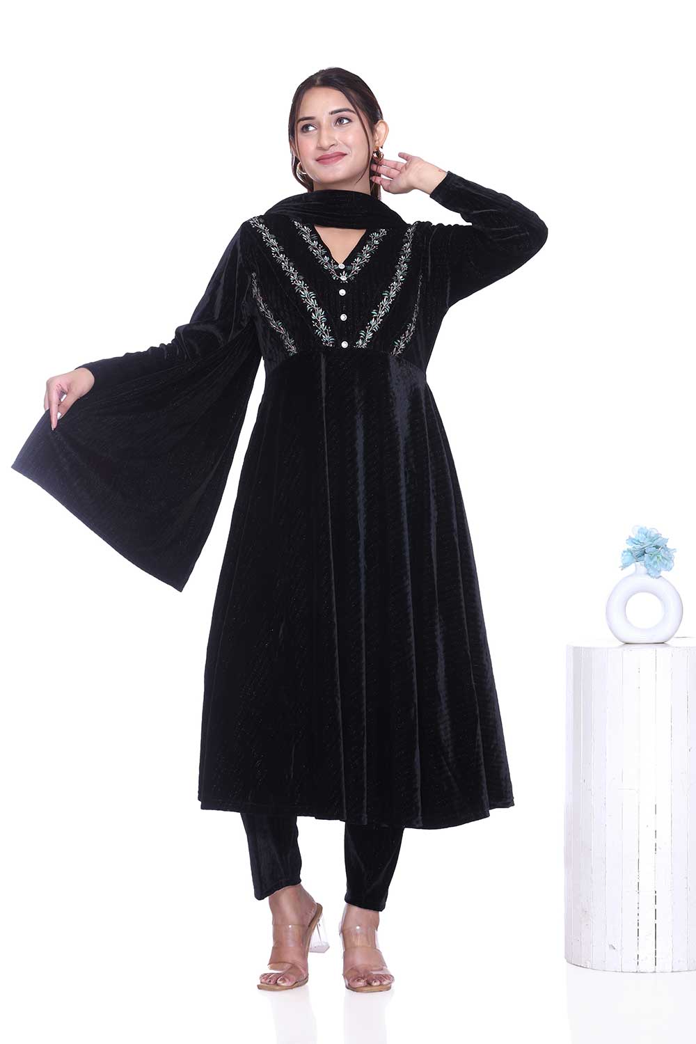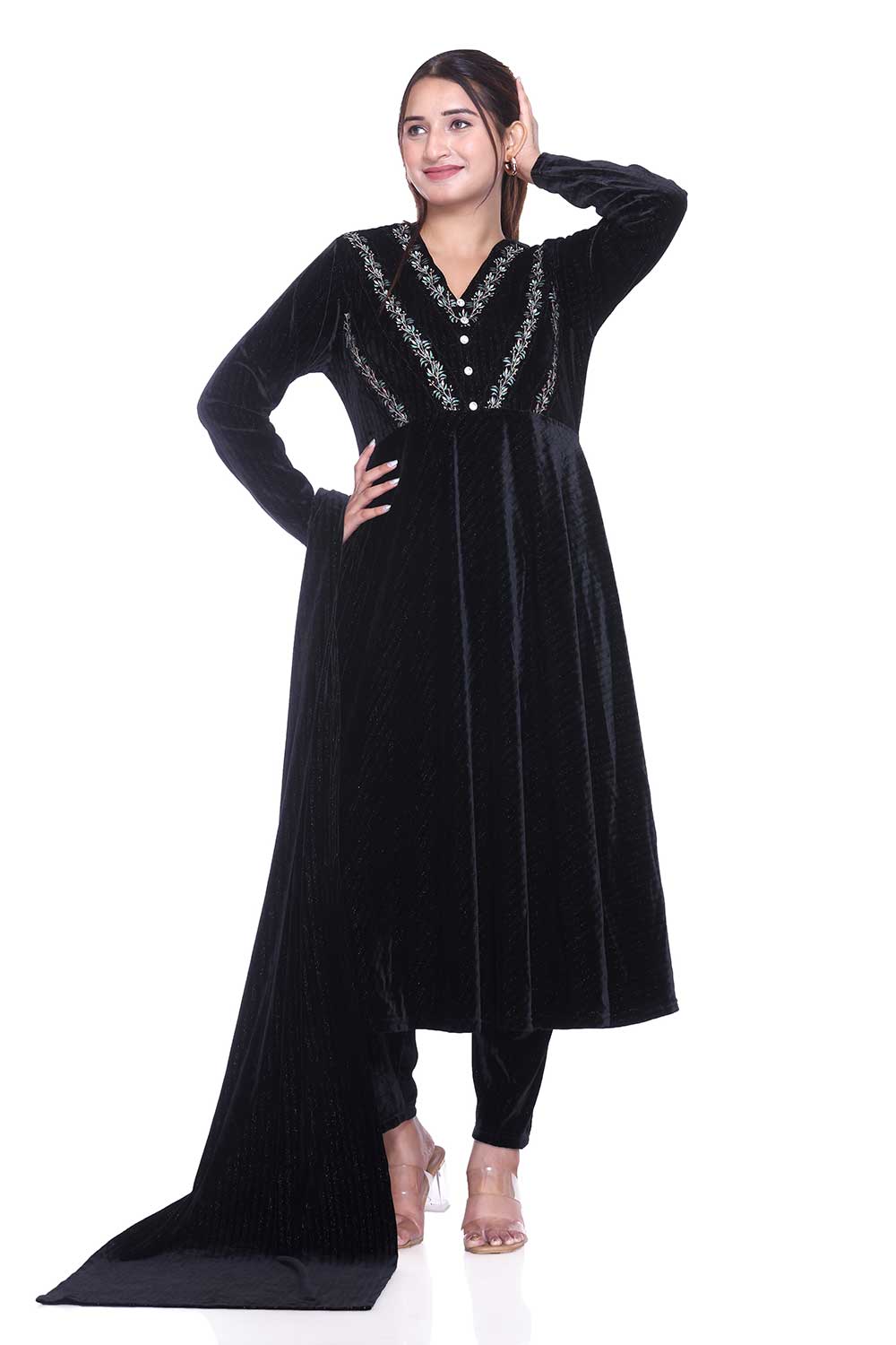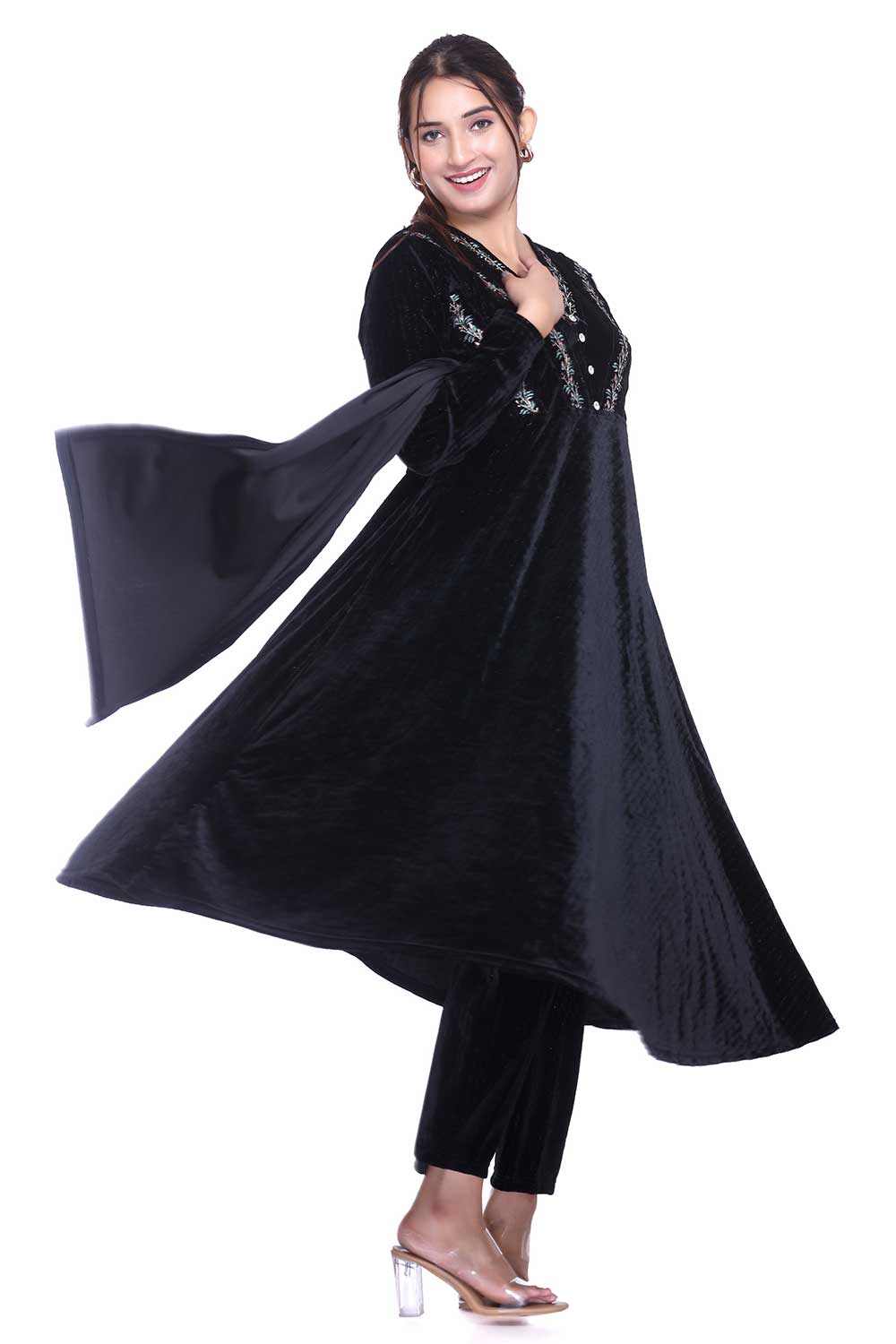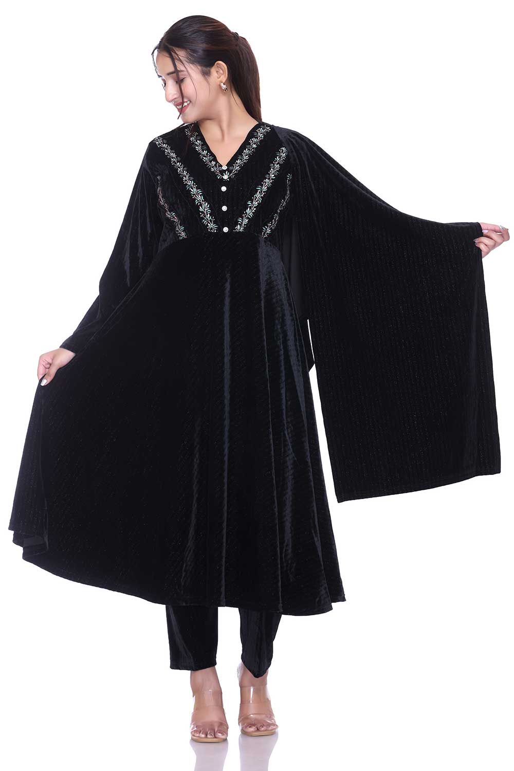 Add timeless elegance to your wardrobe with this stunning black velvet frock set, designed to make you stand out at festive occasions and evening gatherings. The flowy frock-style kurta features delicate embroidery on the neckline with button detailing, paired with straight-fit velvet pants for a graceful yet comfortable look.