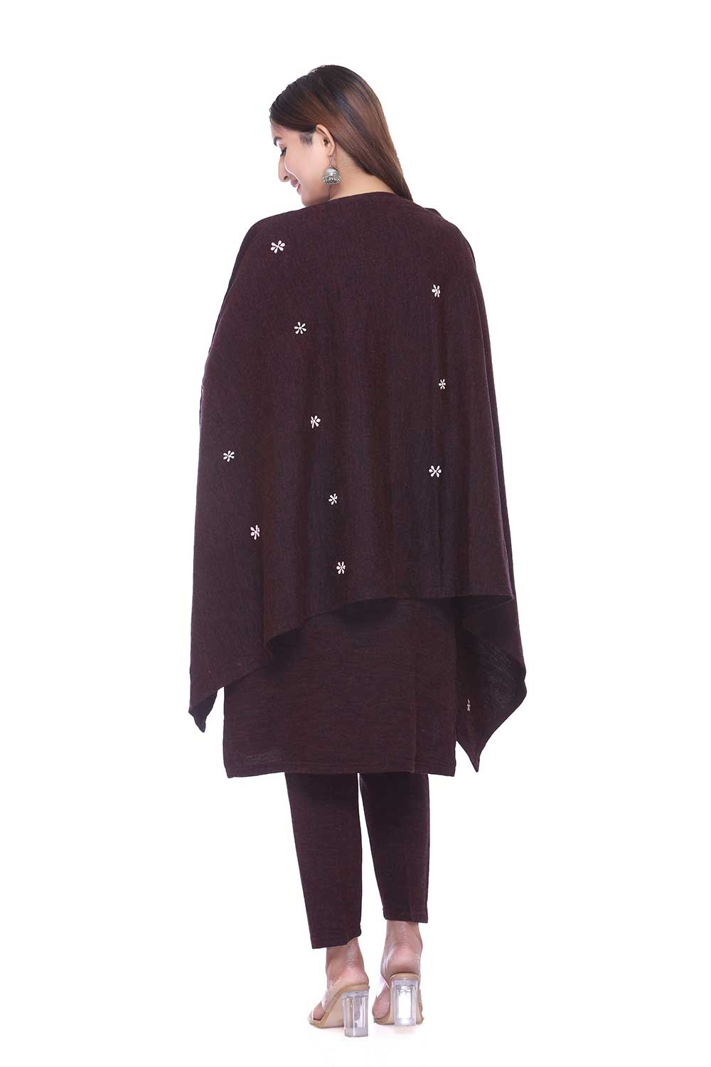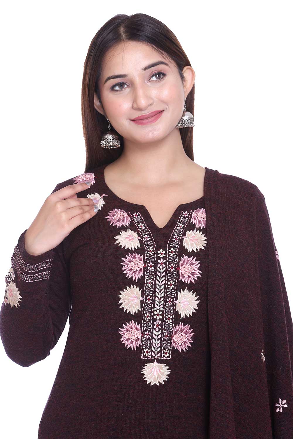 Maroon Wool Blend Embroidered Kurta Set with Pants and Stole