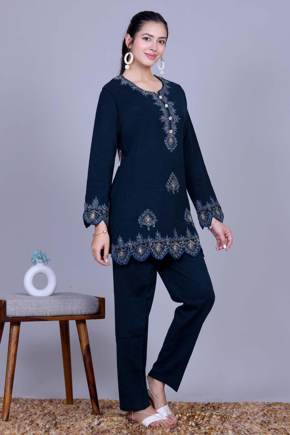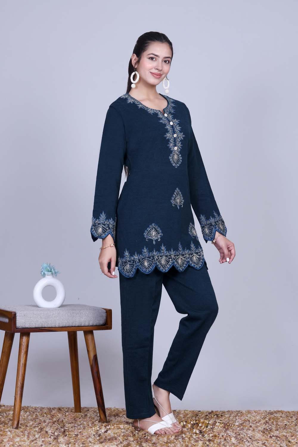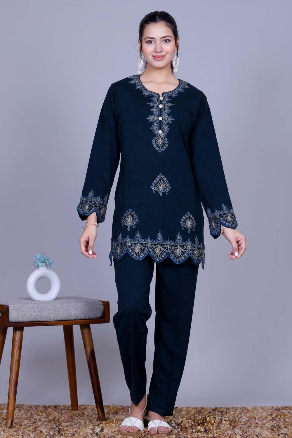 Elevate your ethnic wardrobe with this graceful Turquoise Embroidered Co-ord Set, designed to bring together timeless tradition and refined modern style. The set features a beautifully crafted kurti adorned with intricate silver thread embroidery along the neckline, front panel, sleeves, and scalloped hem.