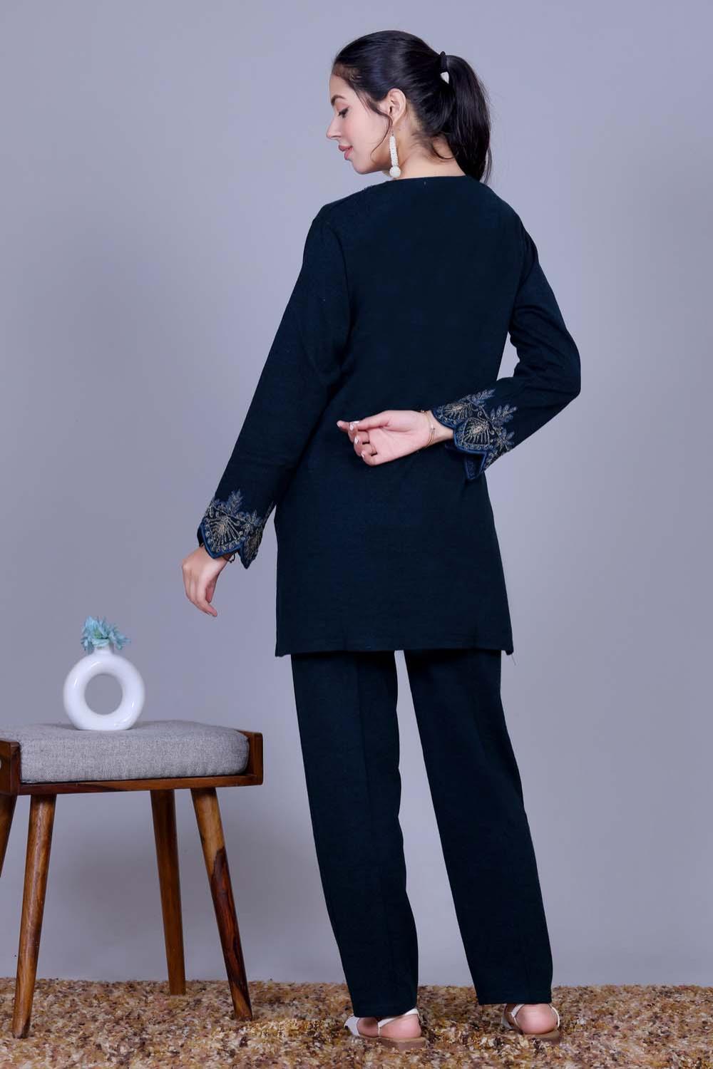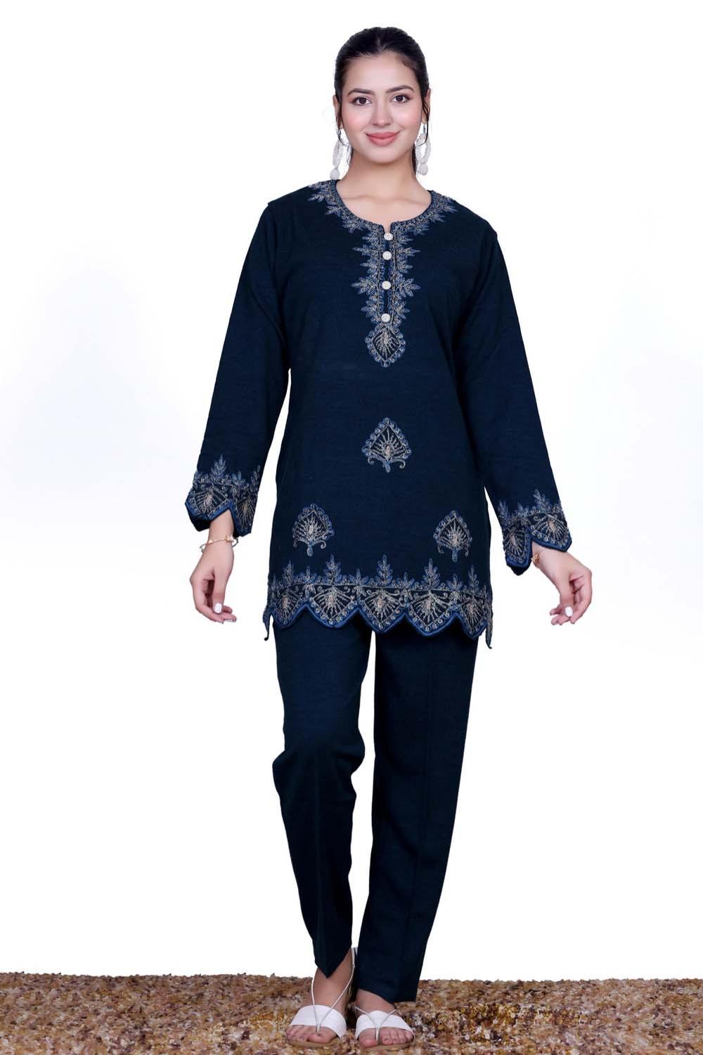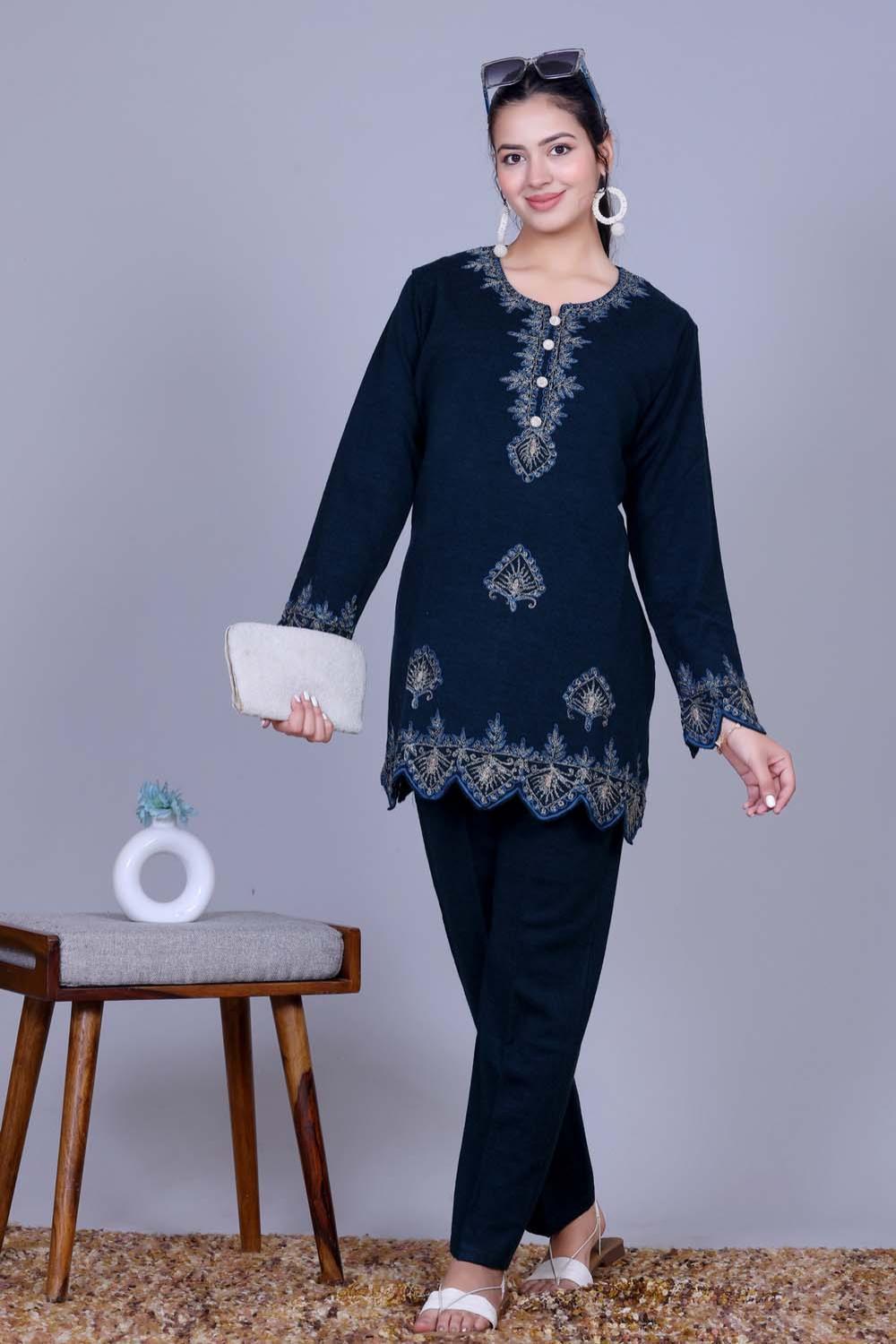 Elevate your ethnic wardrobe with this graceful Turquoise Embroidered Co-ord Set, designed to bring together timeless tradition and refined modern style. The set features a beautifully crafted kurti adorned with intricate silver thread embroidery along the neckline, front panel, sleeves, and scalloped hem.